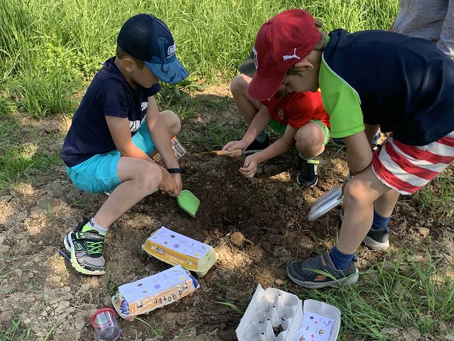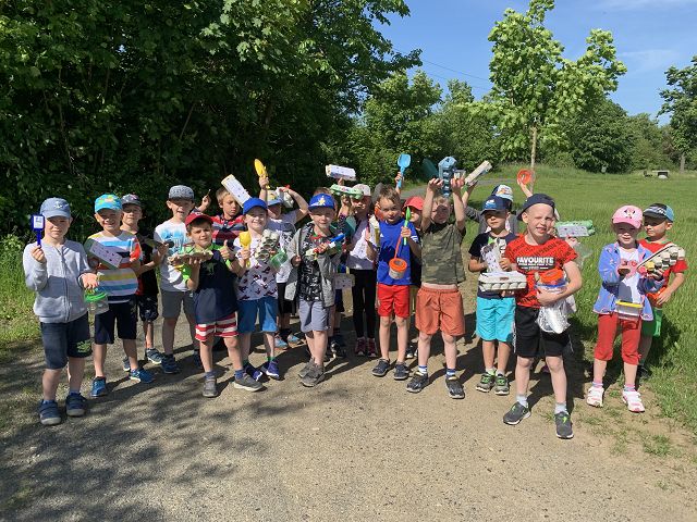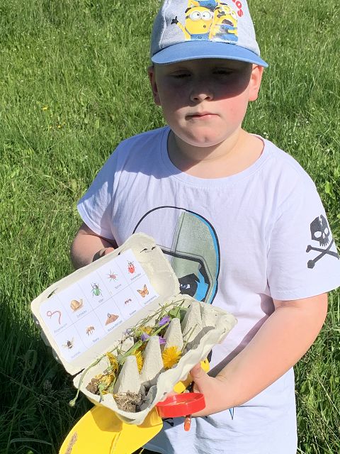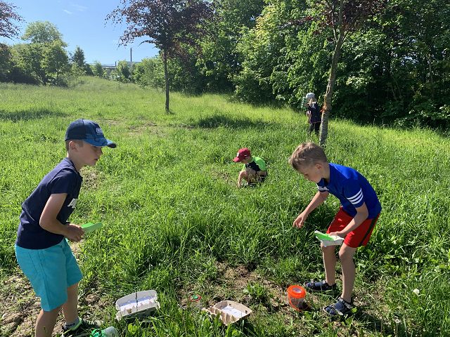 Ausgestattet mit einer selbstgestalteten Sammelbox, Schaufel und Becherlupe wurden Blumen, Gräser, Insekten, Regenwürmer usw. entdeckt, gesammelt und beobachtet.