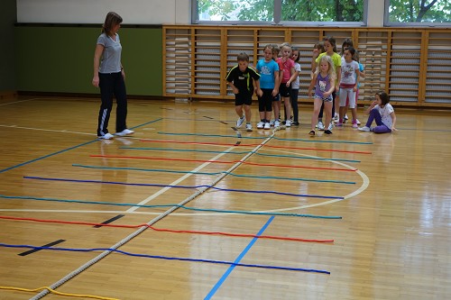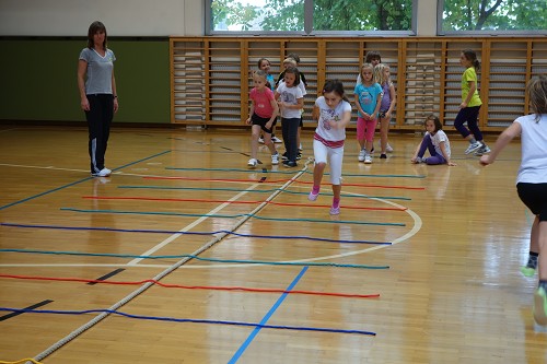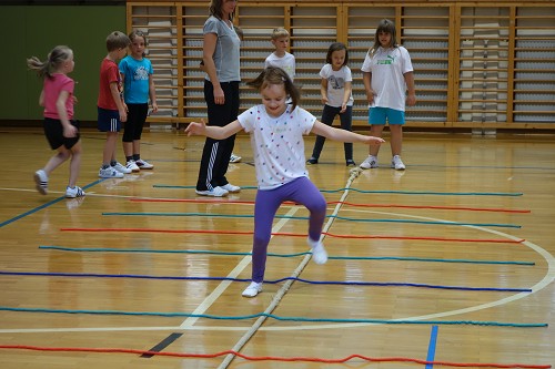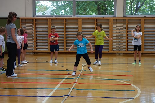 Die Kinder der 2b zeigen viel Ausdauer bei der Schulung ihrer Koordination an der Koordinationsleiter. Auch viele Spiele werden in die Stunden der Aktion "Bewegte Klasse" eingebaut.