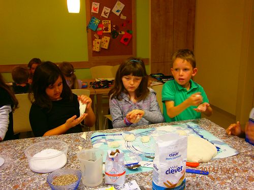 Auf dem Weg zur Erstkommunion Die Kinder der zweiten Klassen backen gemeinsam mit ihrer Religionslehrerin Gabriele Nigischer Brot. Zurück Weiter