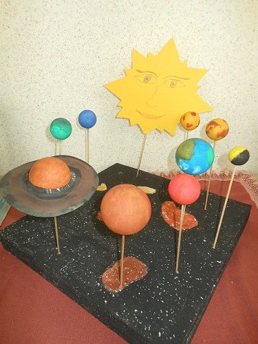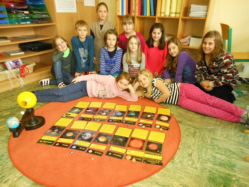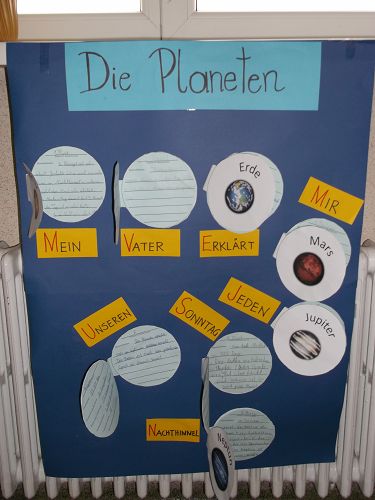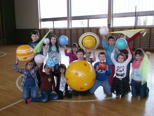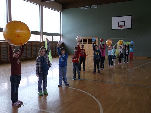 Die Kinder gestalteten Mappen zum Thema, lasen Texte, machten ein Planetenbüchlein und sangen zum Thema passende Lieder. Im Turnsaal wurde das Umkreisen der Sonne dargestellt und zwar mit aufblasbaren Planeten. Manche Kinder überlegten sich sogar zu Hause, wie man Planeten sonst noch herstellen könnte. Dabei entstanden ein Sonnensystem aus Styroporkugeln und Planeten aus Luftballonen.