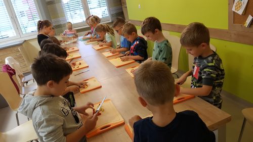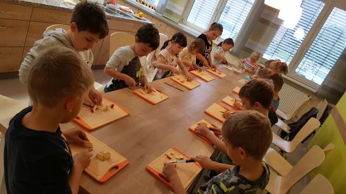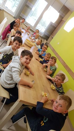 Nachdem im Sachunterricht der 1b die verschiedenen Obst- und Gemüsesorten Thema waren, wurde in der Schulküche gemeinsam Obstsalat gemacht...