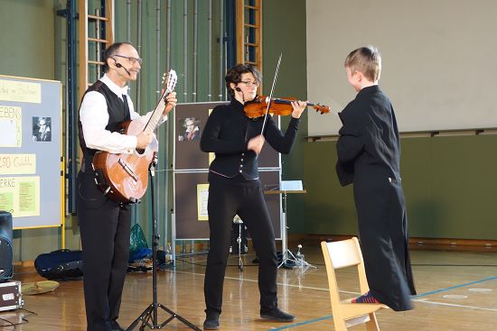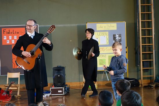 Die beiden kostümierten Musiker begeisterten ihr Publikum mit Elektrogitarren, Violine, Konzertgitarre, Trommeln und natürlich mit wichtigen Informationen über Beethovens Musik und sein Leben.