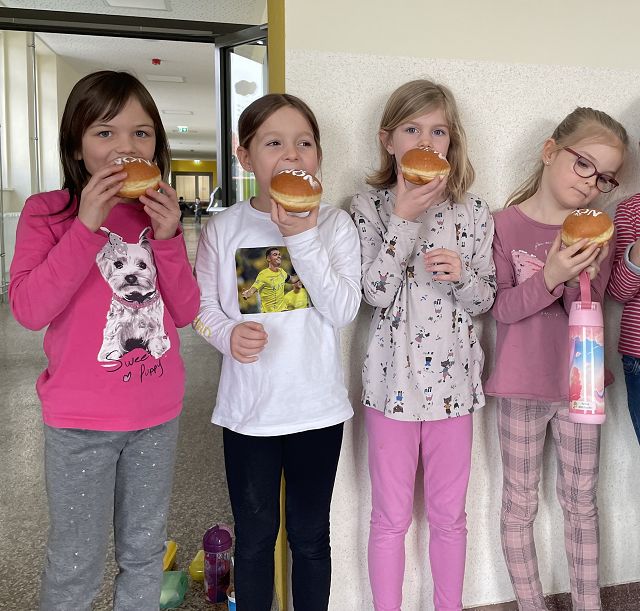 NÖN - Faschingskrapfen für die Volksschule Am 18. Februar gab es für alle Kinder einen Faschingskrapfen, da die Mutter einer Schülerin am Gewinnspiel teilgenommen hatte. Zurück Weiter